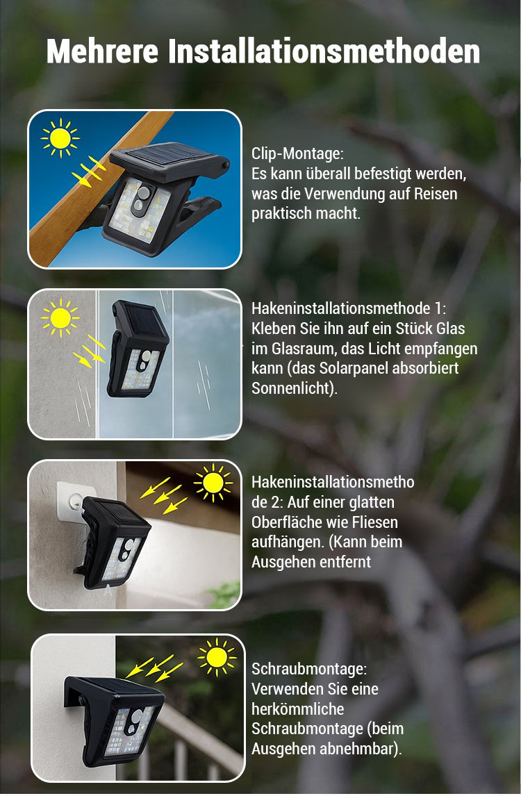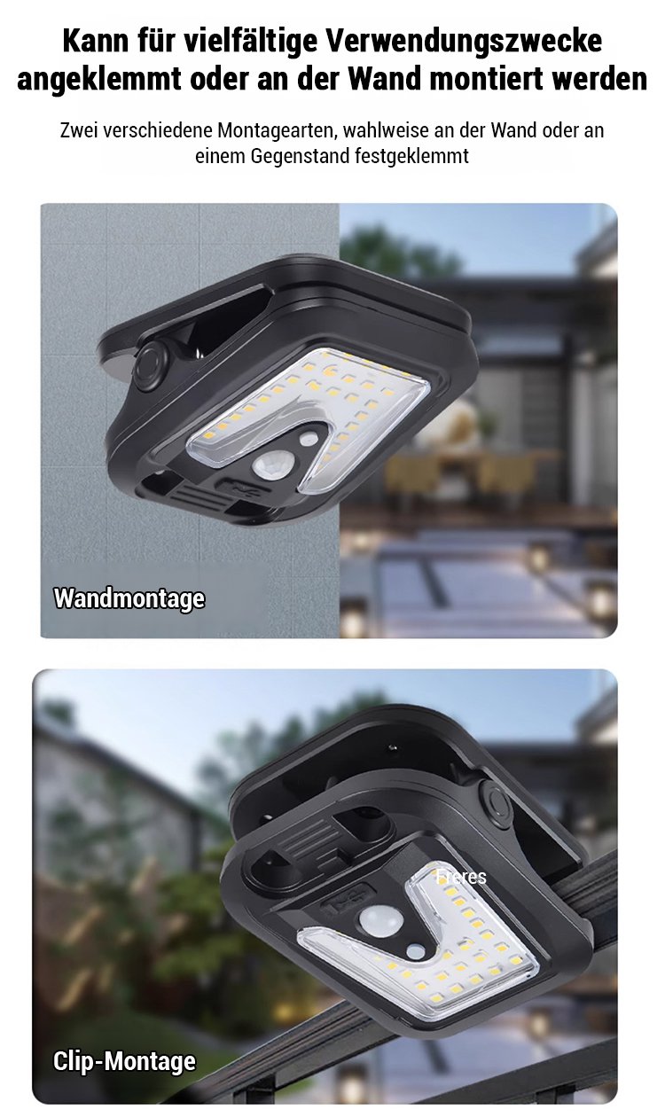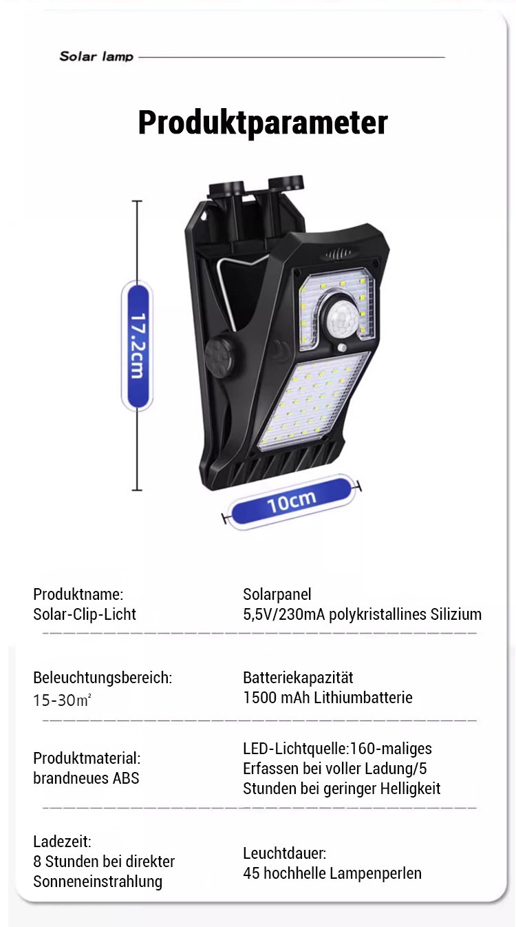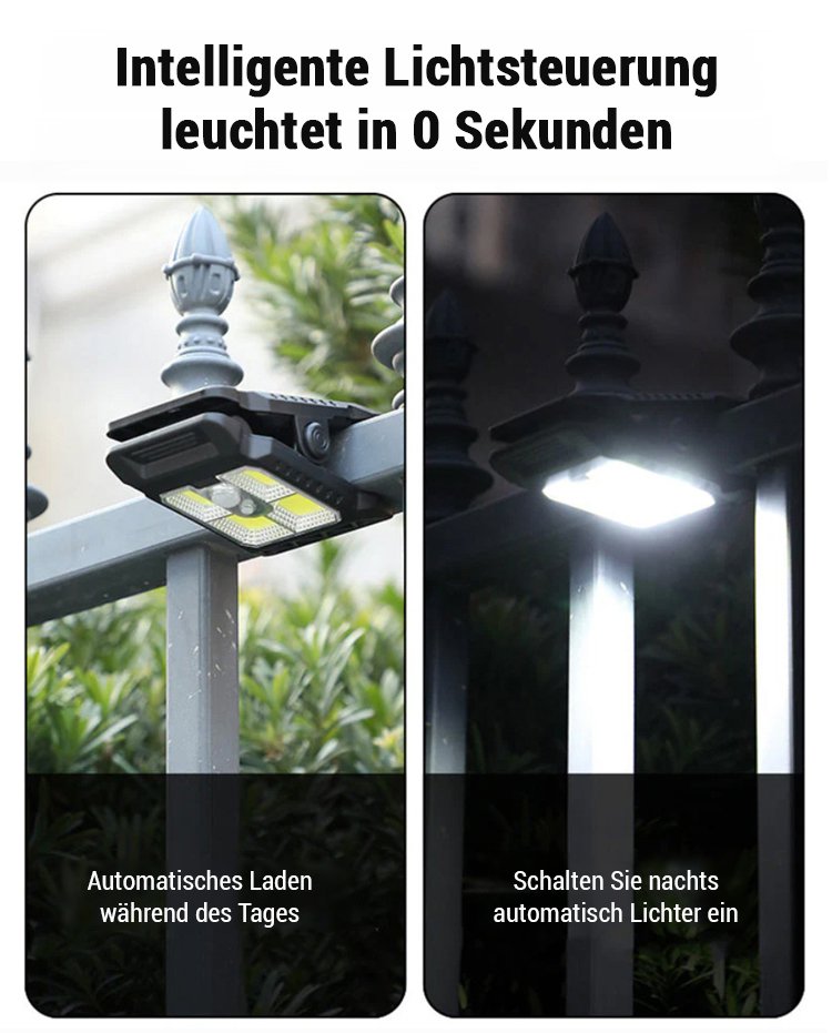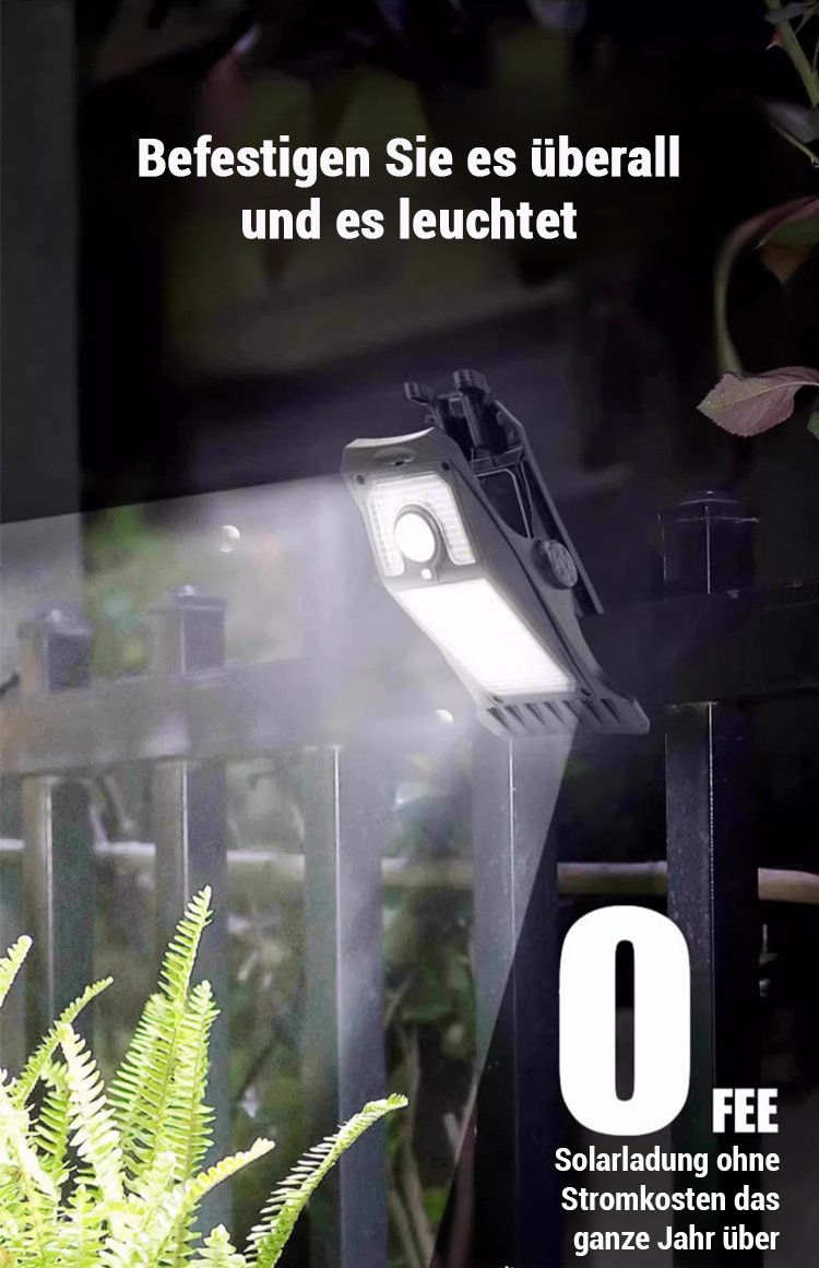 Wetterfeste Sensor-Solar-Klemmleuchte für Außenbereich